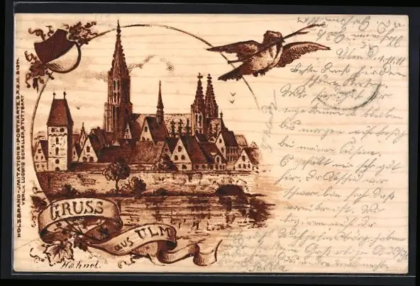 Holzbrand-Imitations-AK Ulm, Totalansicht mit Münster