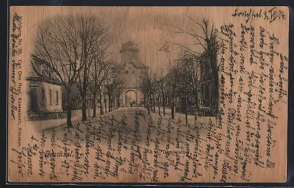 Holzfurnier-AK Bruchsal, Damianstor mit Strassenpartie