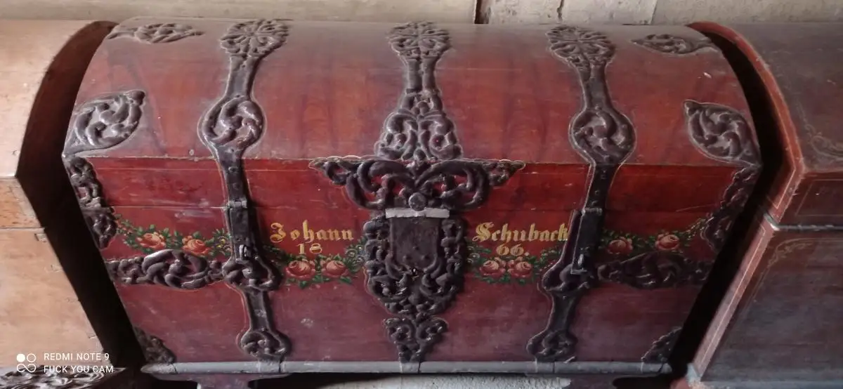 Sehr hübsche Truhe mit 3 Schlössern und Wunderschönen massiven Eisenbeschlägen. Ca 165 x 100 x 90.
