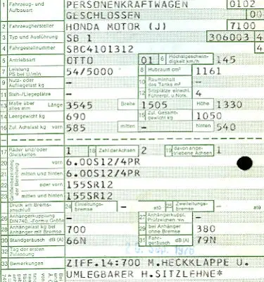 Honda Civic (Typ SB 1) Original Fahrzeugbrief 1976