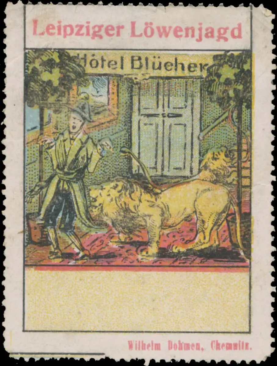 Leipziger Löwenjagd, Druck: Wilhelm Dohmen, Chemnitz, Größe/Zustand: 6x5 , leicht beschädigt, Original alte Reklamemarke die seinerzeit für die Werbung benutzt wurde