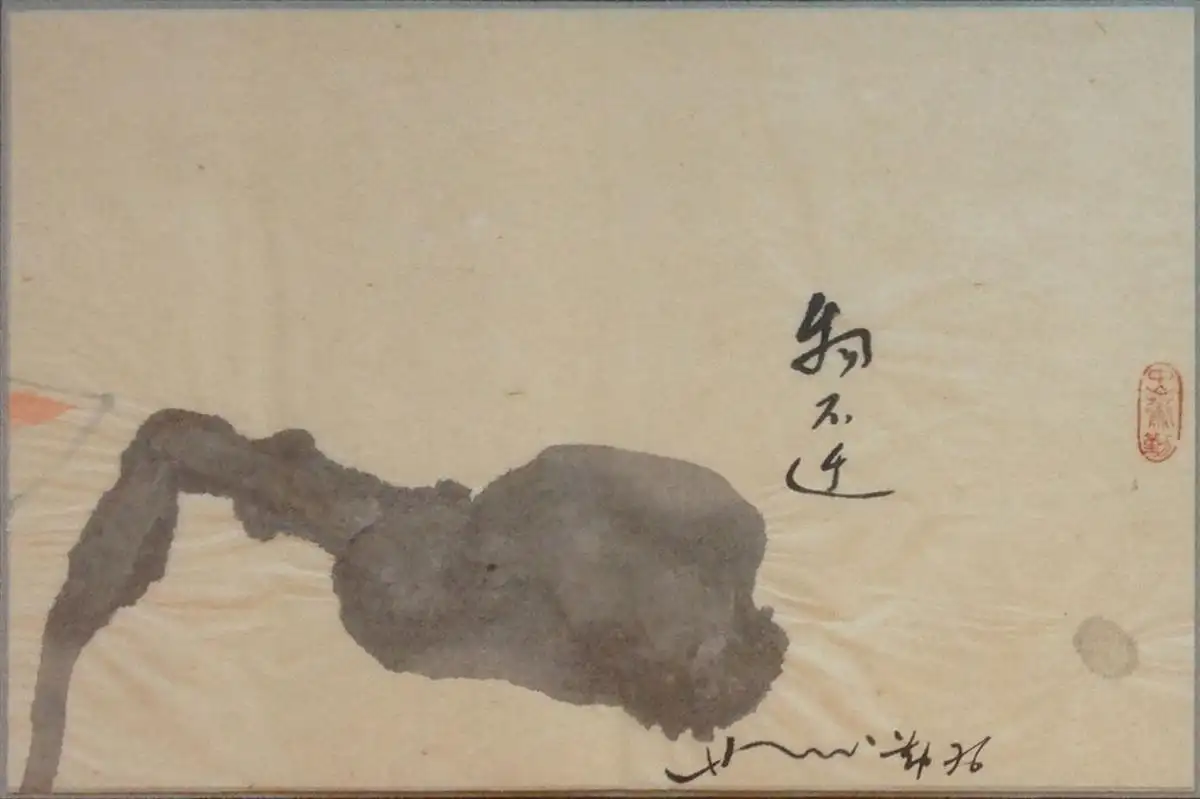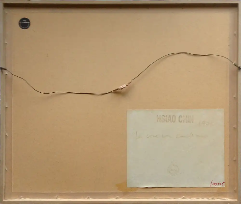 Tusche a./ chamoisefarbenen China, 25 x 38,5 cm. Rechts unten signiert und datiert „(19)76", rechts mittig in chinesischer Schrift betitelt und an der Außenkante rot gestempelt. Rückseitig auf gestempelten Original-Etikett mit der damaligen Mailänder Adresse des Künstlers nochmals handschriftlich italienisch betitelt und datiert „1976“. Das Blatt ist punktuell auf Karton fixiert (nicht kaschiert) und freistehend ohne Passepartout sehr ansprechend professionell gerahmt (Maße mit Rahmen: 55,5 x 65,5 cm).