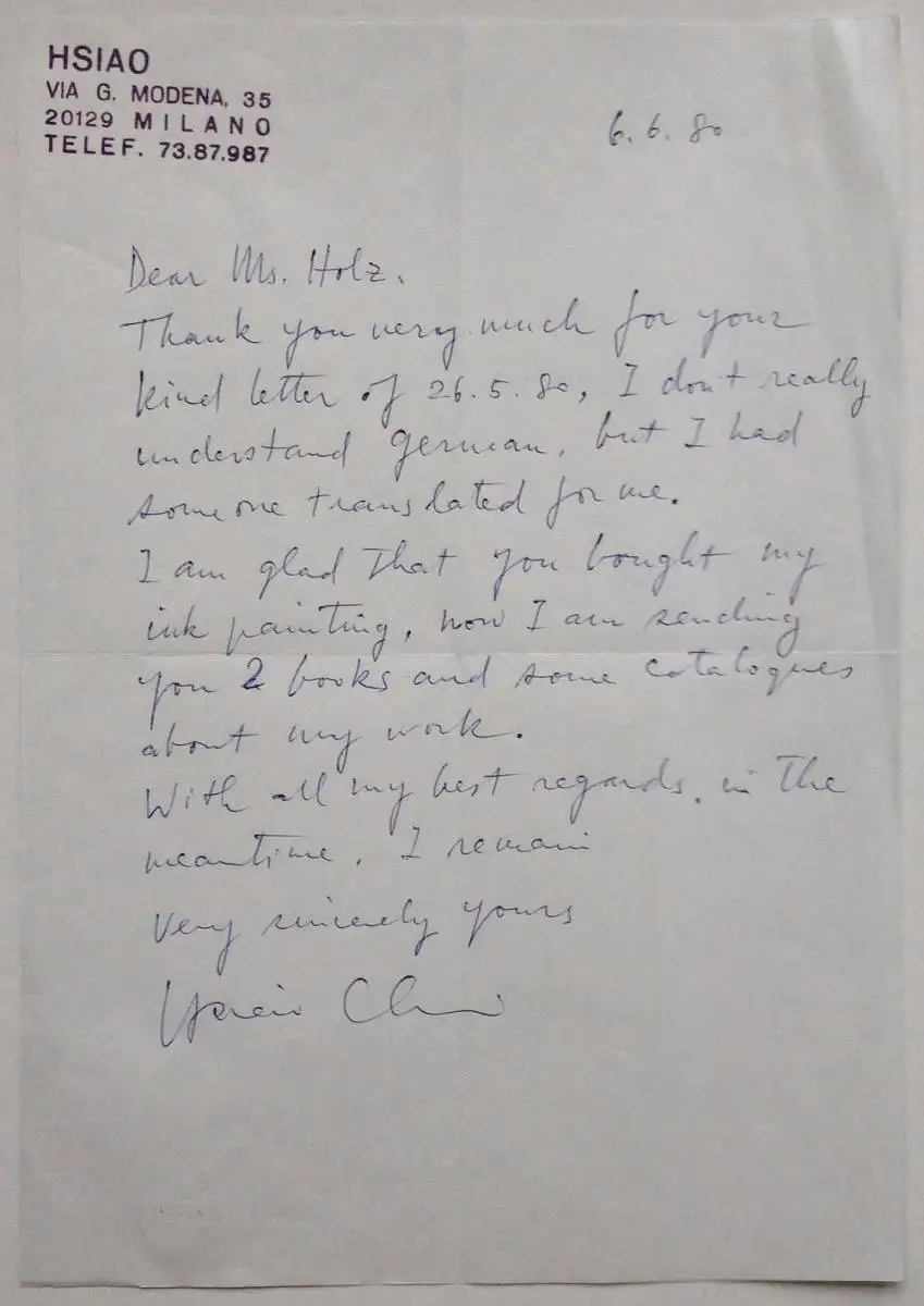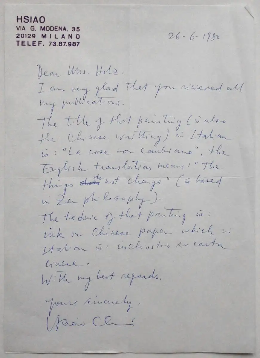 Dazu zwei Autographen, beides handschriftliche Briefe des Künstlers an die Vorbesitzerin, in welchen der Künstler auch die auf der Zen Philosophie basierende Intention des Motivs thematisiert.