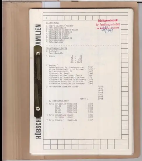 Listung der Ahnen, Kinder, Nachkommen und Stammfolgen der Familien Hübscher, Sommer, Adler und Rackwitz mit Namensregister. Das Exemplar stammt aus dem aufgelösten genealogischen Archiv der "Arbeitsgemeinschaft für Familiengeschichte im Kulturkreis Siemens" mit deren Signaturen und Stempeln auf Einband und erstem Blatt.
