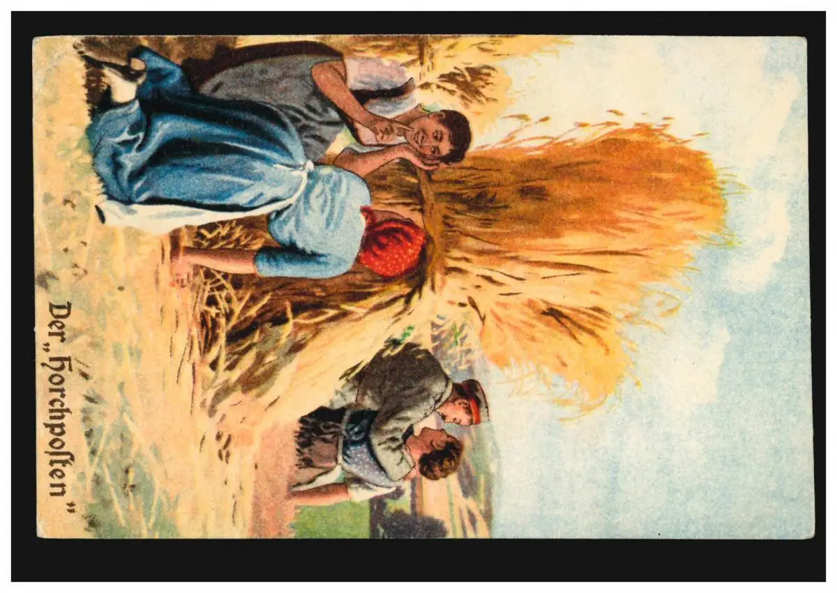 Frauen hinter Getreidegarbe belauschen Liebespaar, Briefstempel: 1. Kurhessisches Feld-Artillerie-Regiment 11, 2. Künstler-Postkartenreihe "Immer Fachmann" - Militärische Fachausdrücke im Spiegel des Humors