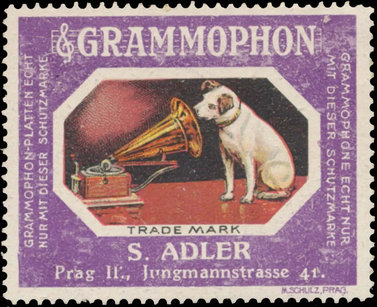 Grammophon-Platten echt nur mit dieser Marke, Jungmannstraße 41, violett, Druck: M. Schulz, Prag, Größe/Zustand: 4x5 , Fehldruck, guter Zustand, Original alte Reklamemarke die seinerzeit für die Werbung benutzt wurde