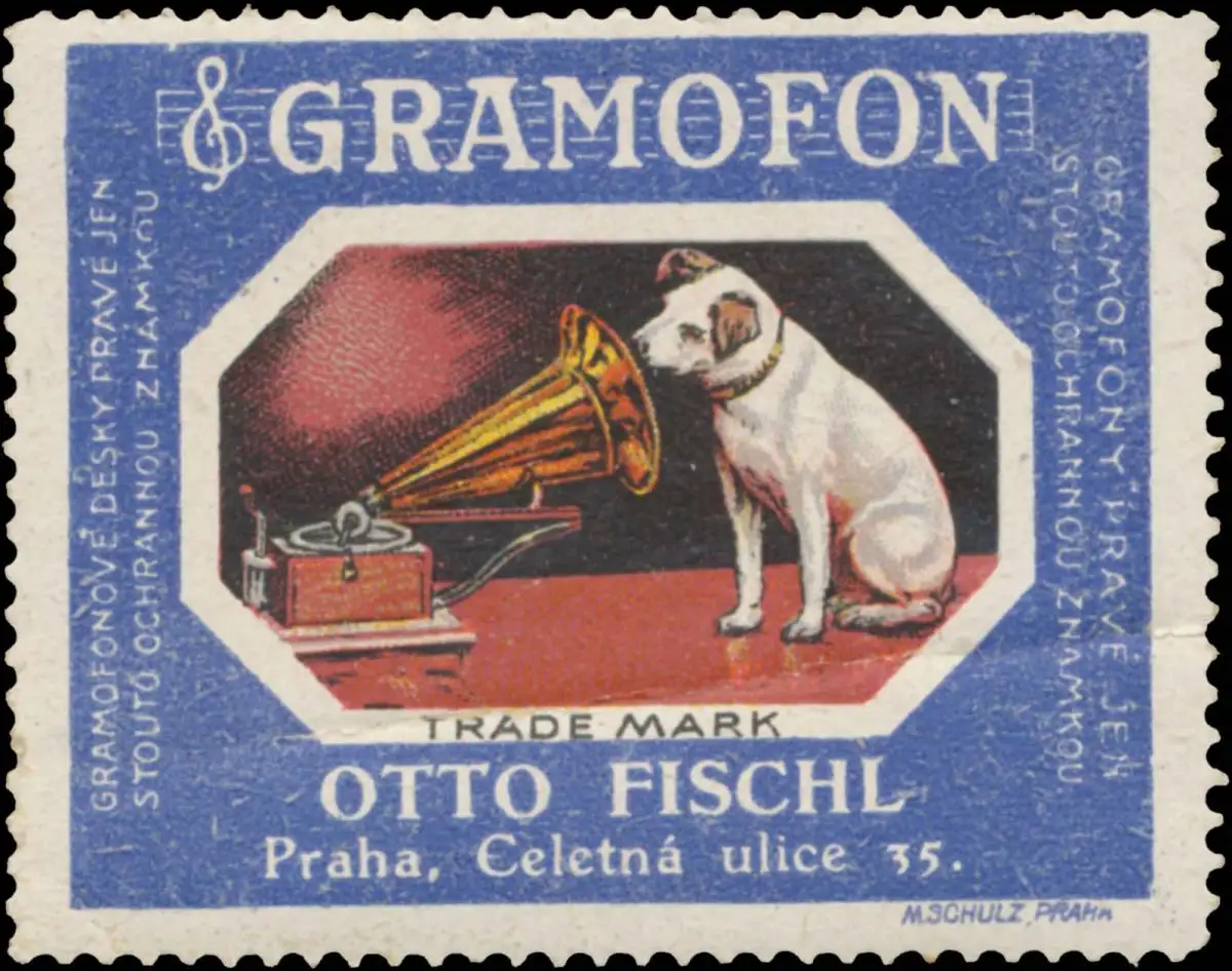 Grammophon-Platten echt nur mit dieser Marke, blau, Druck: M. Schulz, Prag, Größe/Zustand: 4x5 , leicht geknickt, Original alte Reklamemarke die seinerzeit für die Werbung benutzt wurde