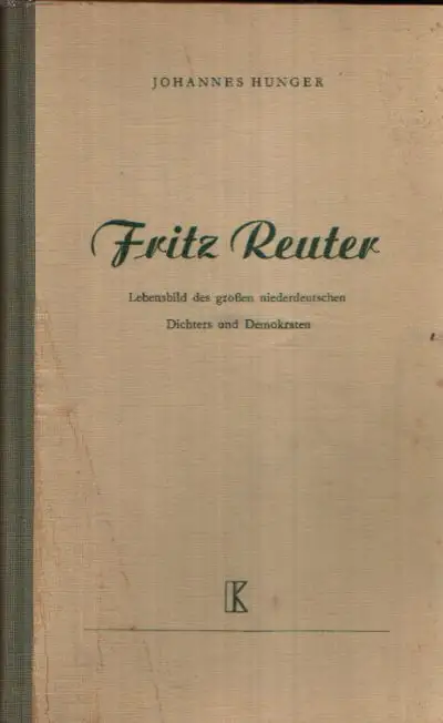 Fritz Reuter-Lebensbild des großen niederdeutschen Dichters und Demokraten; Hunger, Johannes; Biographie; Jugend Lust und Leid: Knabenjahre im Elternhaus zu Stavenhagen; Sturm und Drang: Gymnasial- und Studentenzeit; Mit dem Beil vom Leben zum Tode zu bringen; hinter Festungsmauern; begnadigt und frei; Verspätete Wege ins Leben; endlich Anker geworfen; dichterisches Schaffen auf der Lebenshöhe; erfülltes Leben; Ausklang; Liebling der Nation; unsterbliches Leben