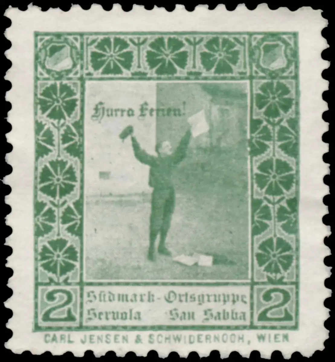 Schule, Südmark, Ortsgruppe Servola San Sabba, Wehrschatzmarke, Spendenmarke, Druckerei: Carl Jensen & Schwidernoch, Wien, Größe/Zustand: 3x3 , guter Zustand, Original alte Reklamemarke die seinerzeit für die Werbung benutzt wurde