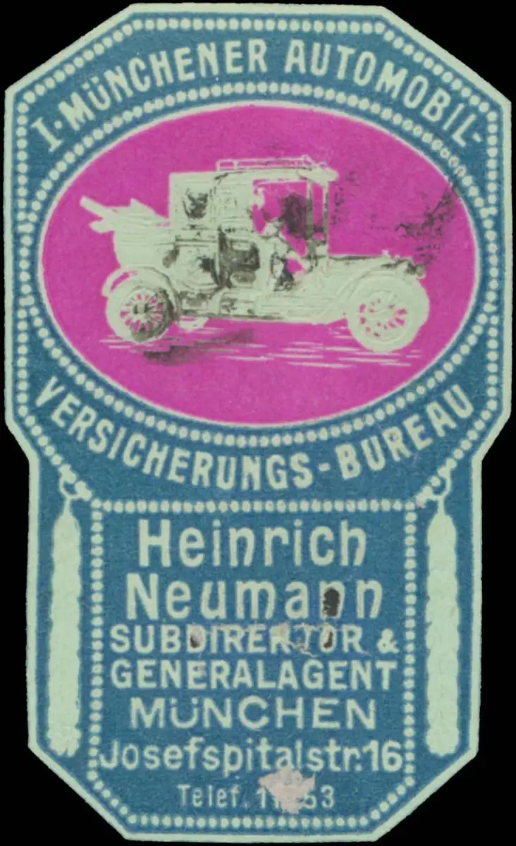 Auto, Versicherung, Subdirektor & Generalagent, Josefspitalstraße 16, Größe/Zustand: 6x4 , beschädigt, Original alte Reklamemarke die seinerzeit für die Werbung benutzt wurde