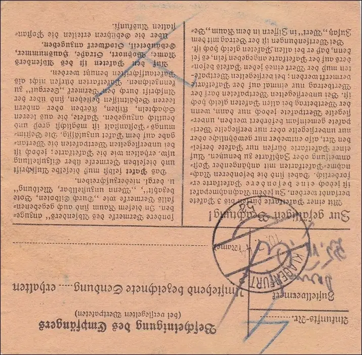 III. Reich: Paketkarte von Wien nach Velden 1944 MeF