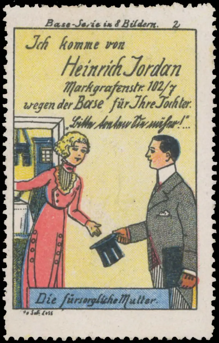 Die fürsorgliche Mutter, Base-Serie 2, Markgrafenstraße 102-7, Größe/Zustand: 6x4 , leicht fleckig, Original alte Reklamemarke die seinerzeit für die Werbung benutzt wurde