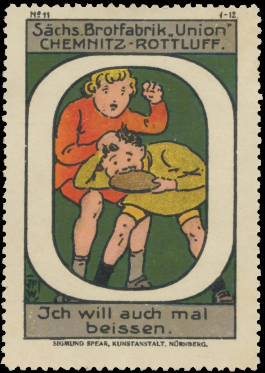 Bäckerei Schlüterbrot Buchstabenserie, Nr. 11, Kinder, Druck: Kunstanstalt Sigmund Spear, Nürnberg, Größe/Zustand: 6x4 , guter Zustand, Original alte Reklamemarke die seinerzeit für die Werbung benutzt wurde