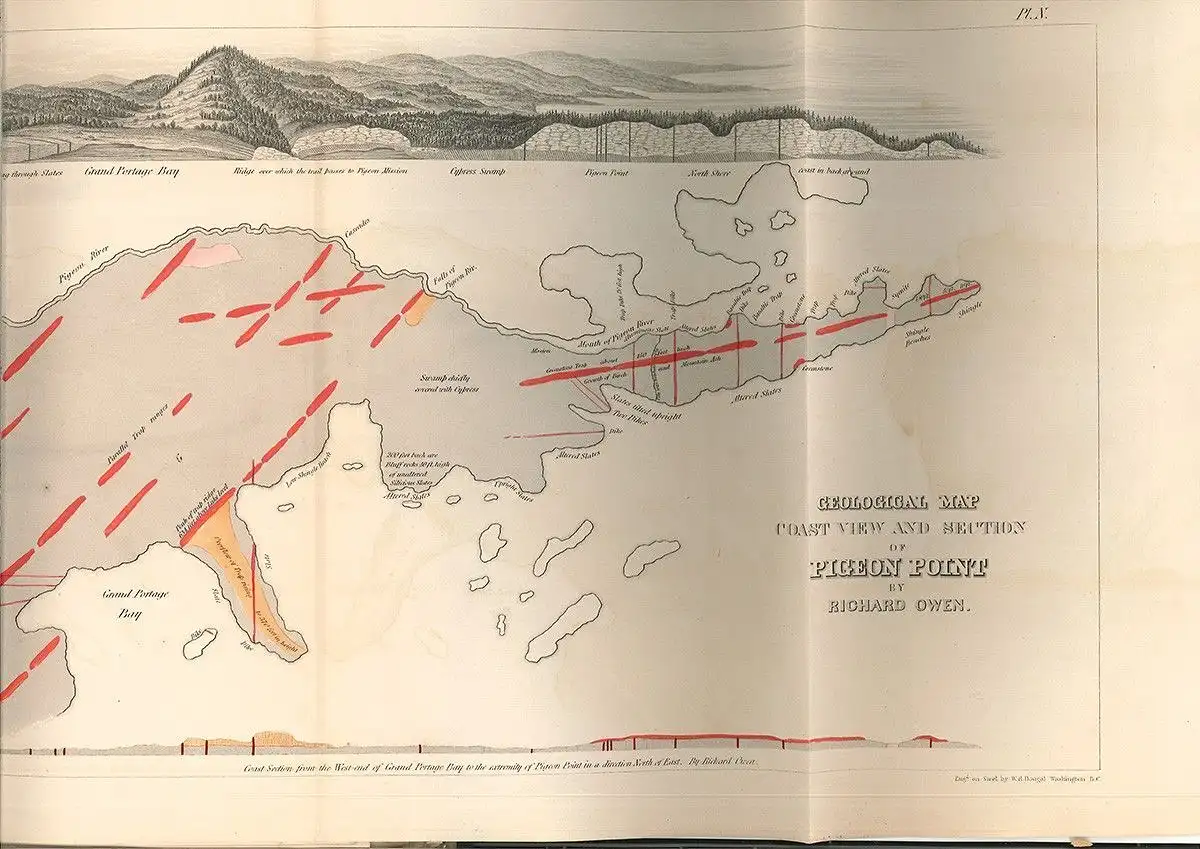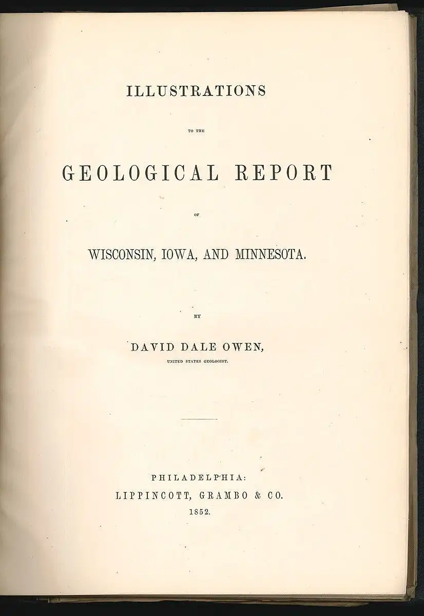 Bemerkungen: Sabin I, 58009 - Kollation der Tafeln: 1, 1a-d, II, 2a-b, 3, 3a, 4, 5, 5a,-b, 6, 7, 8, 8a, 9, 10, 11, 12, 12a-b, 13, 14, 15. Bei Sabin ist von 15 Taf. u. 21 Karten die Rede. Die Taf. in Stahlstich tlw. nach Daguerotypien. Unter den Karten 1 große kolor. Karte: Geological Map of Wisconsin, Iowa, and Minnesota im Format 112 x 70 cm. - Complete set. - David Dale Owen conducted the first geological surveys of Indiana, Kentucky, and Arkansas. He was appointed the first Geologist for the State of Indiana (1837-39), and worked as the State Geologist of Kentucky in 1854-1857; he was appointed State Geologist of Arkansas in 1857, continuing as the Kentucky geologist without pay. He returned to Indiana as State Geologist in 1859-1860. - Of particular note is a well-preserved color fold-out map entitled "Geological Map of the North Shore of Lake Superior".