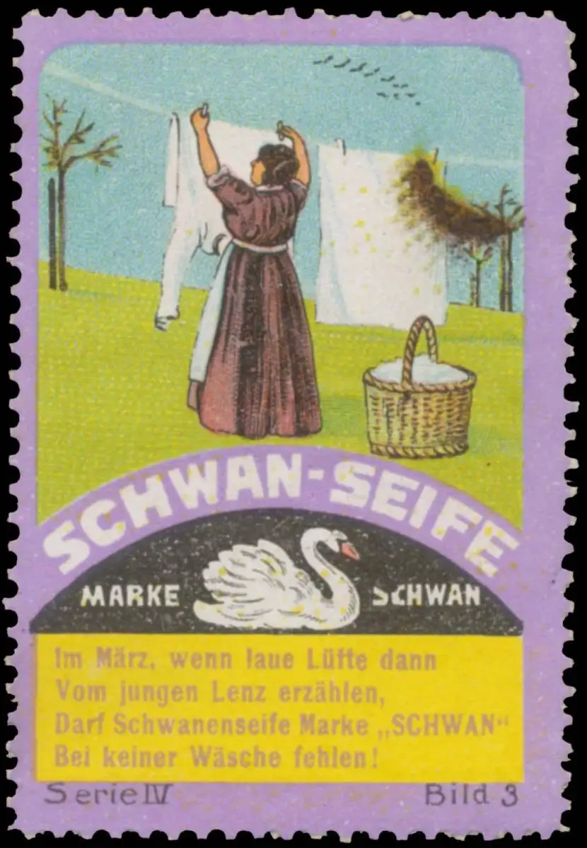 vom jungen Lenz erzählen darf Schwanenseife Marke Schwan bei keiner Wäsche fehlen! Serie IV, Bild 3, Variante 2, Größe/Zustand: 5x4 , guter Zustand, Original alte Reklamemarke die seinerzeit für die Werbung benutzt wurde
