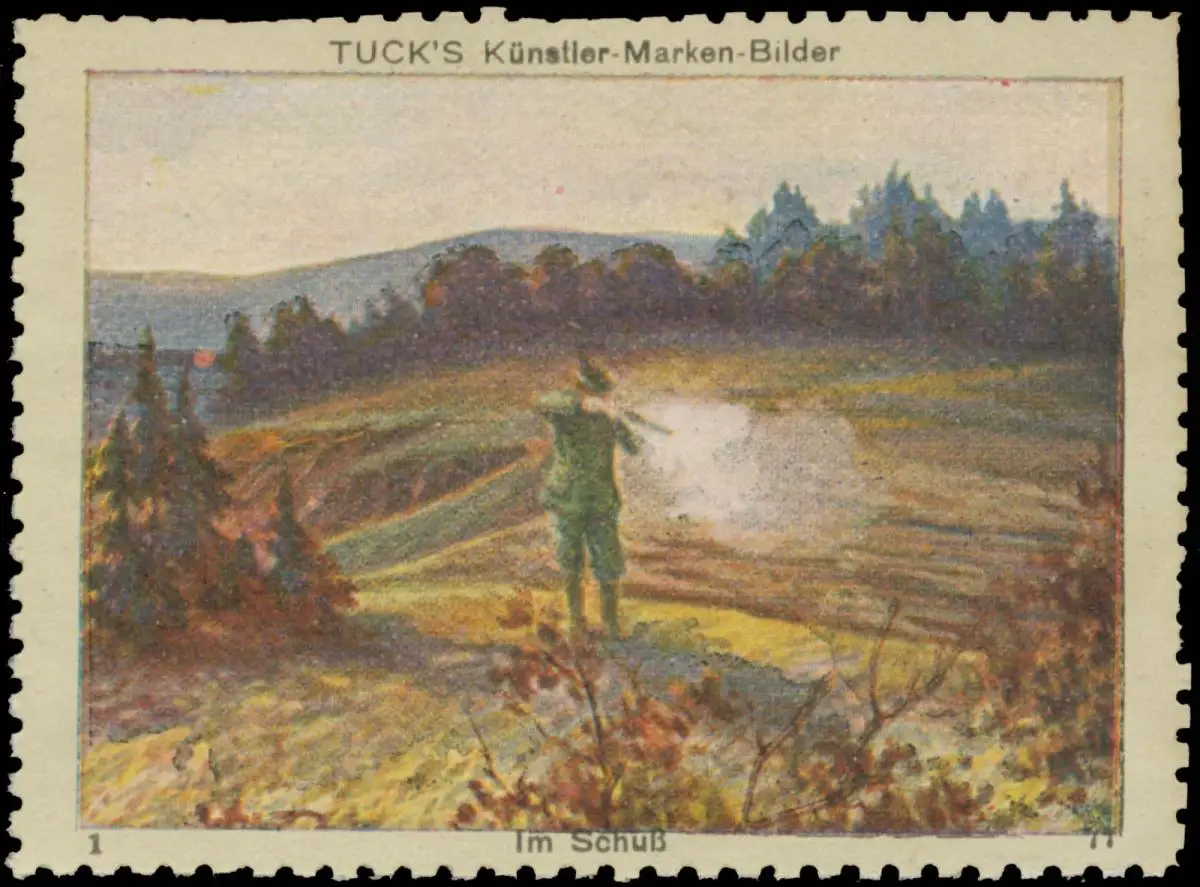 Jagd, Serie 77, Bild 1, Tucks Künstler-Marken-Bilder, Propaganda-Marke, Auflage 3000 Stück, Größe/Zustand: 4x7 , guter Zustand, Original alte Reklamemarke die seinerzeit für die Werbung benutzt wurde