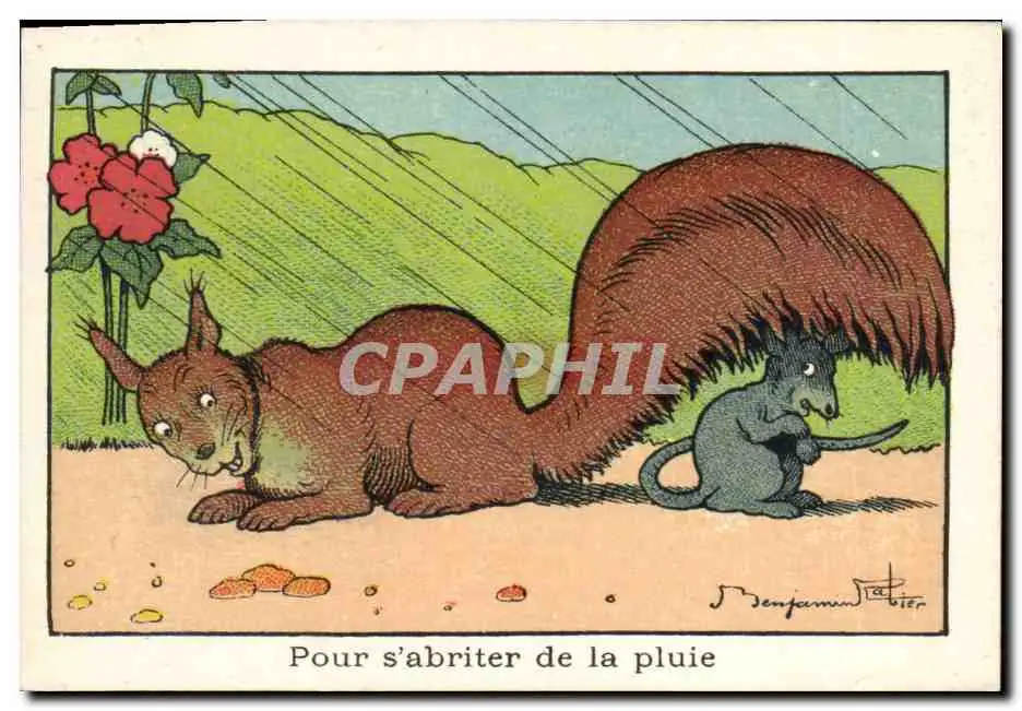 Image Benjamin Rabier Pour s&#39abriter de la pluie Ecureuil Souris