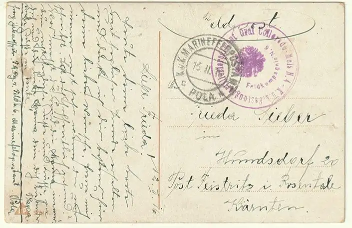 Bemerkungen: Gelaufen mit Stempel. Einkreisst. violett neben K. u. K.MFPA/13.II.16/c Pola