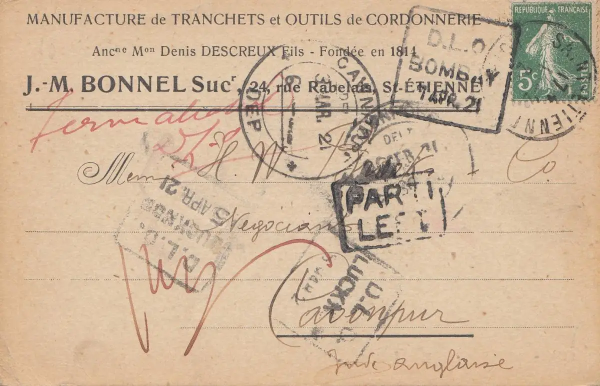 India: 1921: St. Etienne/France post card to Cawnpur
