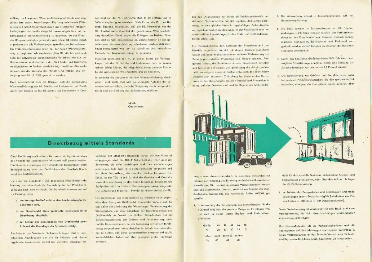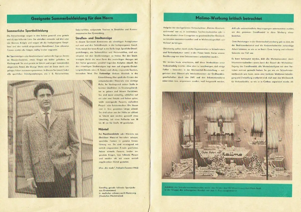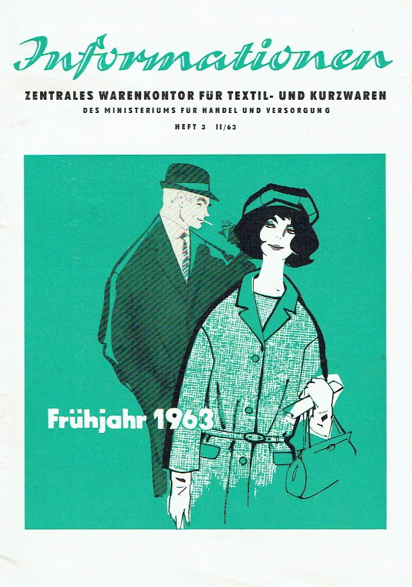 guter bis sehr guter Zustand, geringe Gebrauchs- und Alterungsspuren: Ränder teils etwas knittrig - Vorderseite mit kleinem Dreiangel im senkrechten Rand, Zu unseren gemeinsamen Aufgaben im Jahre 1963 - Zur zentralen Einkaufsveranstaltung für das 2. Halbjahr 1963 bei Textil- und Kurzwaren - Was tut sich in der komplex-territorialen Warenauslieferung? - Direktbezug mittels Standards - Leicht körperbetonte Mode - Kinderbekleidung - Geeignete Sommerbekleidung für den Herrn - Malimo-Werbung kritisch betrachtet - Die Krönung der Textilveredlung - Spezitex - Ein Warenzeichenverband hilft Ihnen verkaufen - Freundliche Paragrafen - Modische Knöpfe - Eine Wanderausstellung für den Textilhandel - Warum eigentlich neue Größen in der DOB? - Maßtabelle für Damenoberbekleidung (DOB), Softcover, ca. 21 x 29,5, 24 Seiten mit einigen Bildern