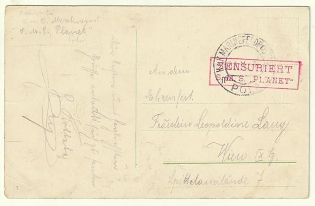 Bemerkungen: Gelaufen m. Stempel: Torpedodivision-Fahrzeuggruppe. Zensuriert/S.M.S. "Planet". Kastenst. zweizeilig rot. KALIS nicht bekannt - Tsd K.u.K. Marinefeldpostamt/30. X. 18/m Pla.