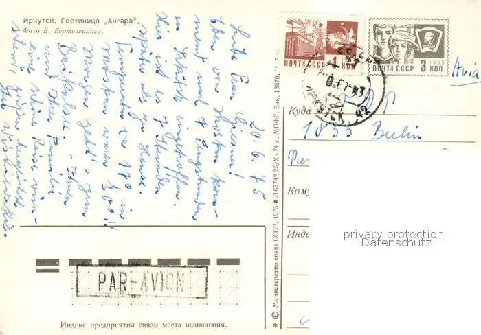 Irkutsk Hotel Angara Irkutsk postalisch gelaufen nach 1965 Erhaltung siehe scans [DarjaD84] DarjID84