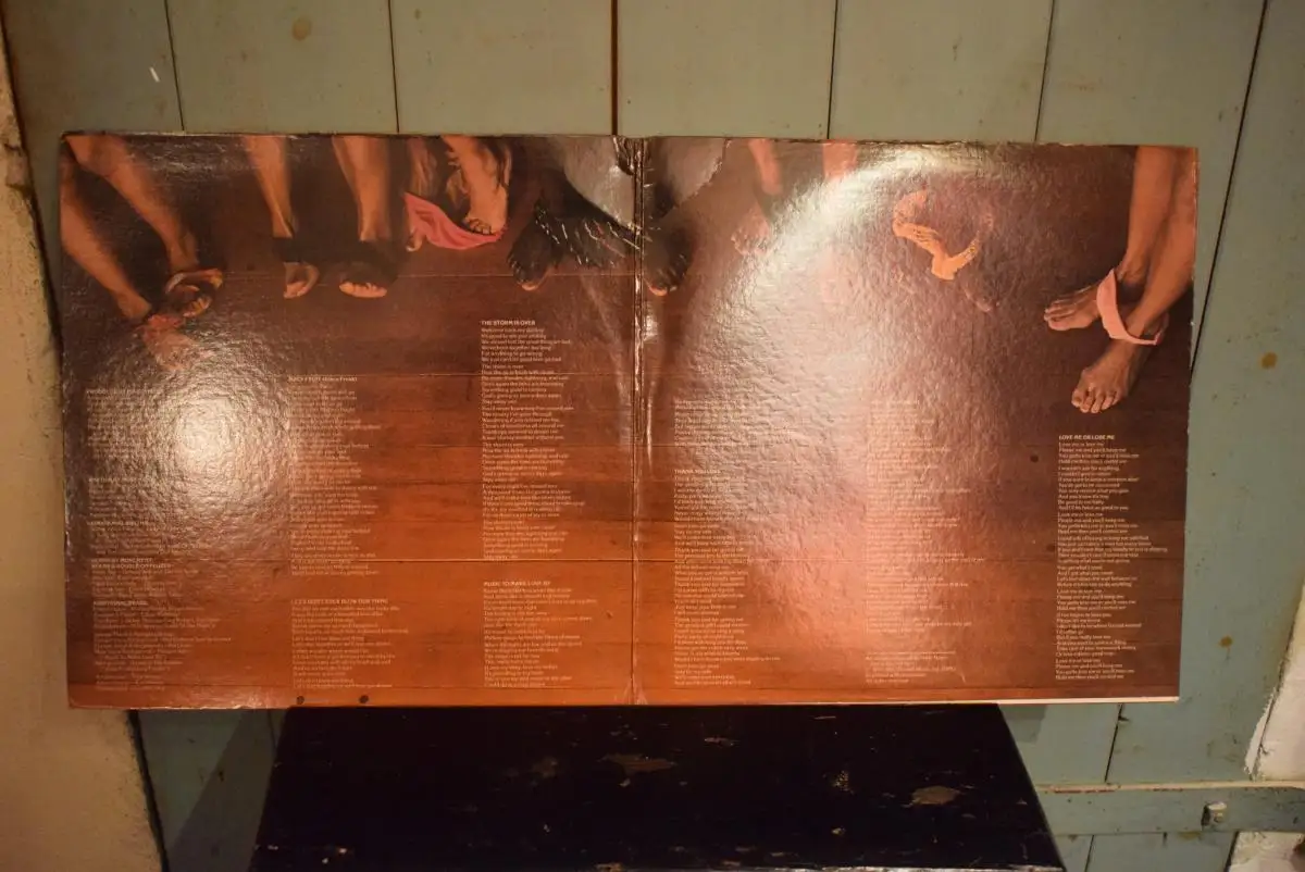 Cover mit starken umlaufenden Gebrauchspuren , auch auf den Flächen , mehrere Einrisse im Bereich Einschub und gegenüber ,LP mit deutlichen aber rein oberflächlichen Gebrauchspuren , spielt noch sehr gut .