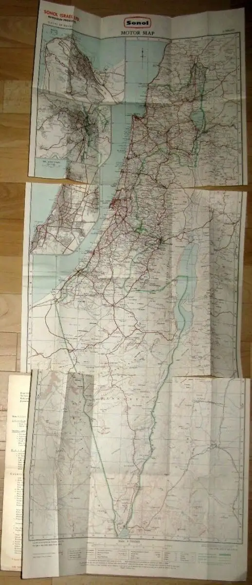 guter bis sehr guter Zustand, geringe Gebrauchs- und Alterungsspuren: Umschlag abgenutzt und verschmutzt - Karte tadellos, Sonol offices - Sonol service & filling stations - Road signs - Map 1:500.000, revised by the Survey of Israel, December 1957 - Register, kartoniert / Papier, ca. 14 x 16,5 (aufgeklappt ca. 39 x 98)