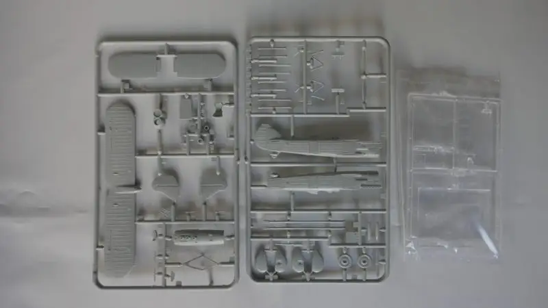 Einzelteile (Plastikbauteile) sind noch am Rahmen fixiert, Sichthülle wurde geöffnet.