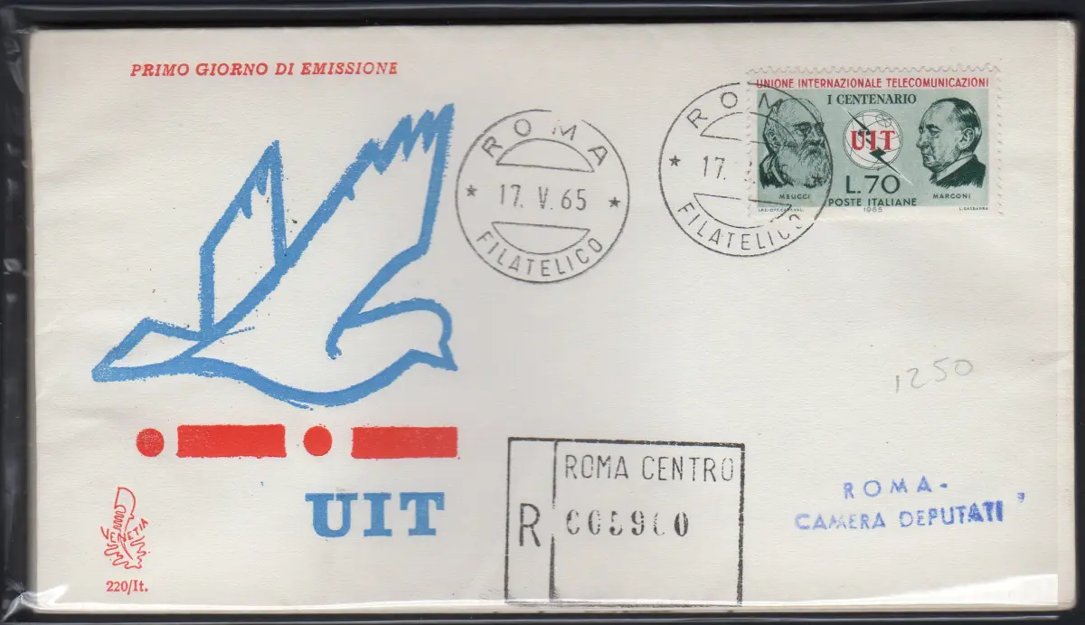 Italia FDC Venetia 1965 U.I.T. gereist Racc. für Italien Italien Italien 1965 U.I.T. auf Reiseumschlag Racc. für Italien mit Annullierung der Ankunft Abfahrt Rom Philatelico - R von kleinem Einschreiben Cod. 640 / Venetien