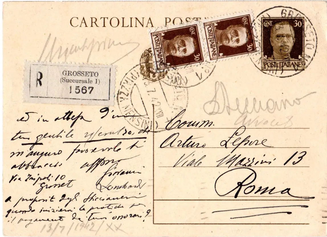 Italien 1942, Paar 30 C. Zusatzfr. auf eingeschr. 30 c. Ganzsache v. GROSSETO
