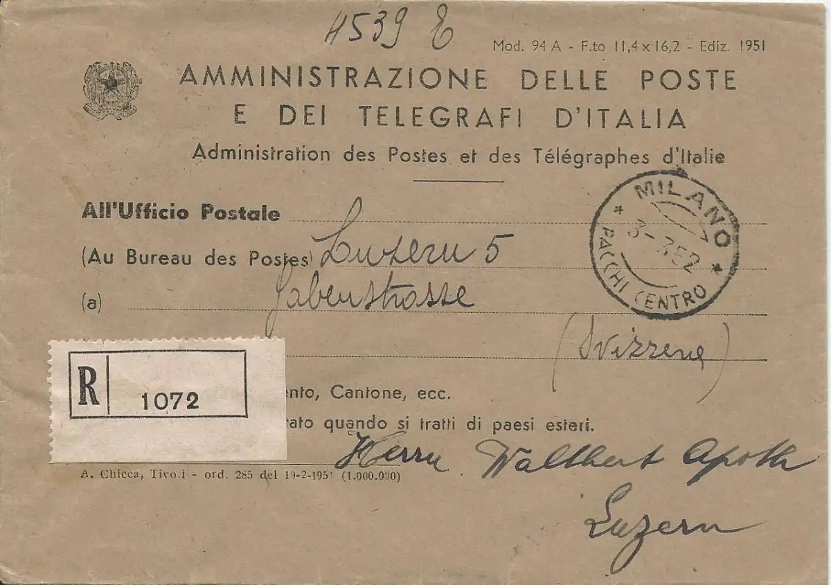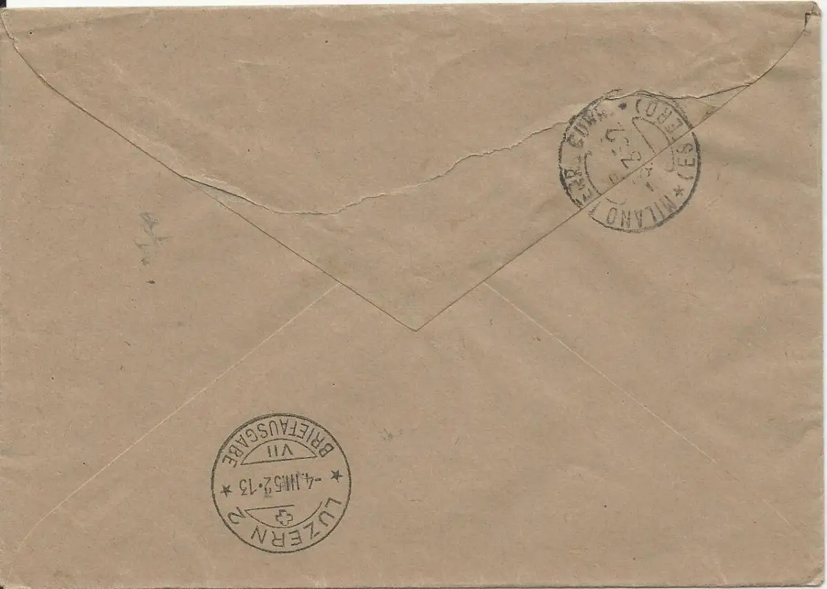 Italien 1952, portofreier Postsache Brief, Einschreiben v. Milano i.d. Schweiz