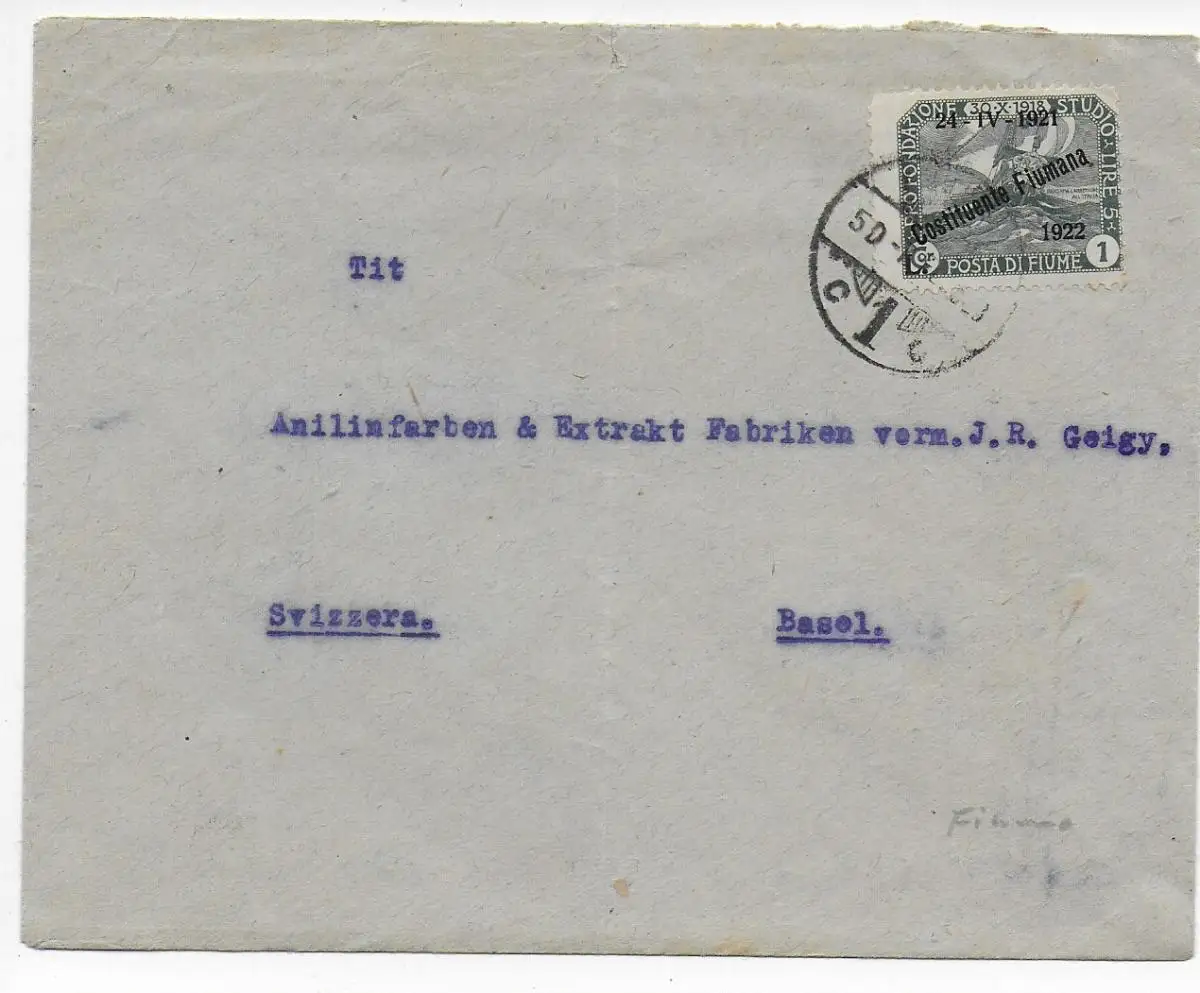Italien Bedarf Fiume 1922 nach Basel,