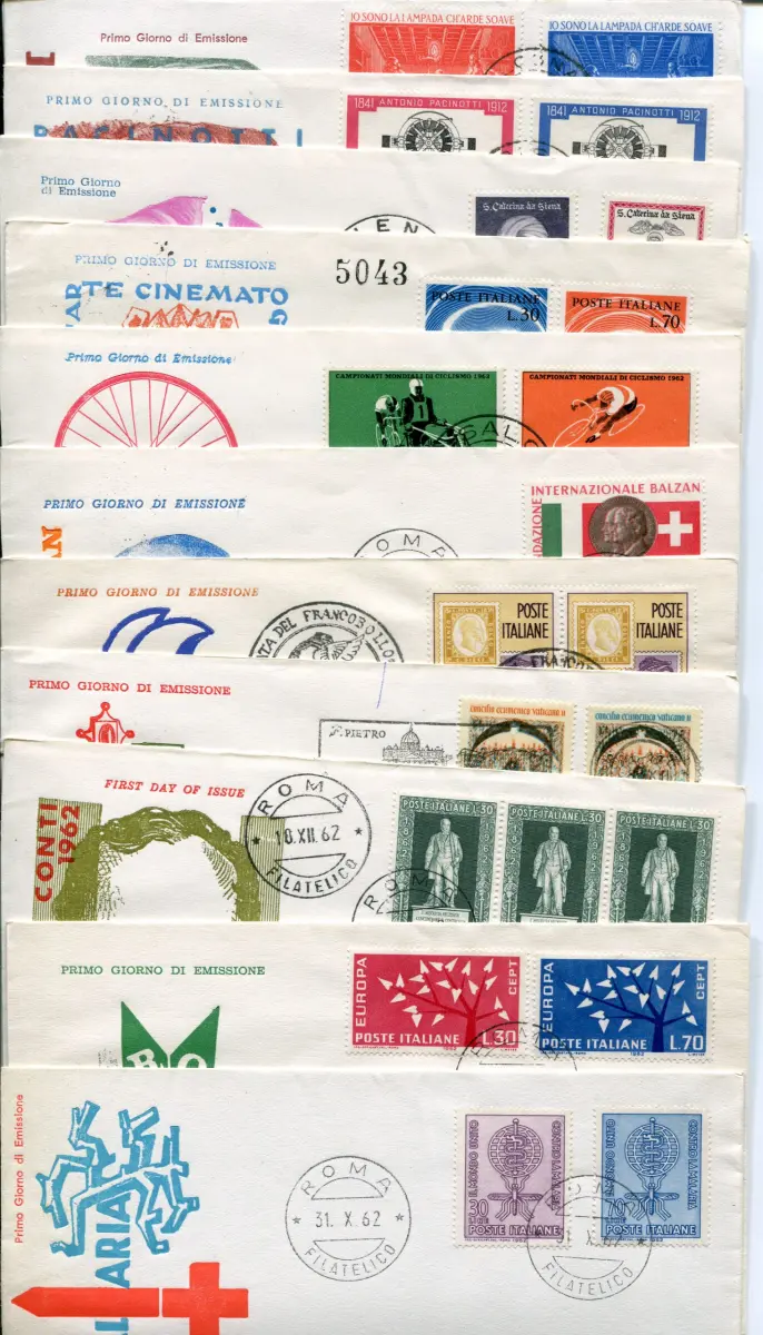 Italien FDC Venetia 1962 Kompletter Jahrgang Italien 1962 Kompletter Jahrgang auf Umschlag FDC 11 Umschläge, die meisten per Einschreiben mit Annullierung der Ankunft gereist - in sehr gutem Zustand - Cod. 350 / Venetien