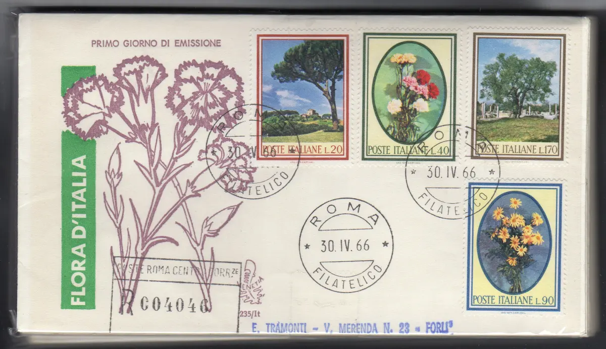 Italien FDC Venetia 1966 Flora voyata Racc. für Italien Italien Italien 1966 Flora auf Reiseumschlag Racc. für Italien mit Annullierung der Ankunft - Abreise Annullo Roma Philatelico Cod. 696/Venetia
