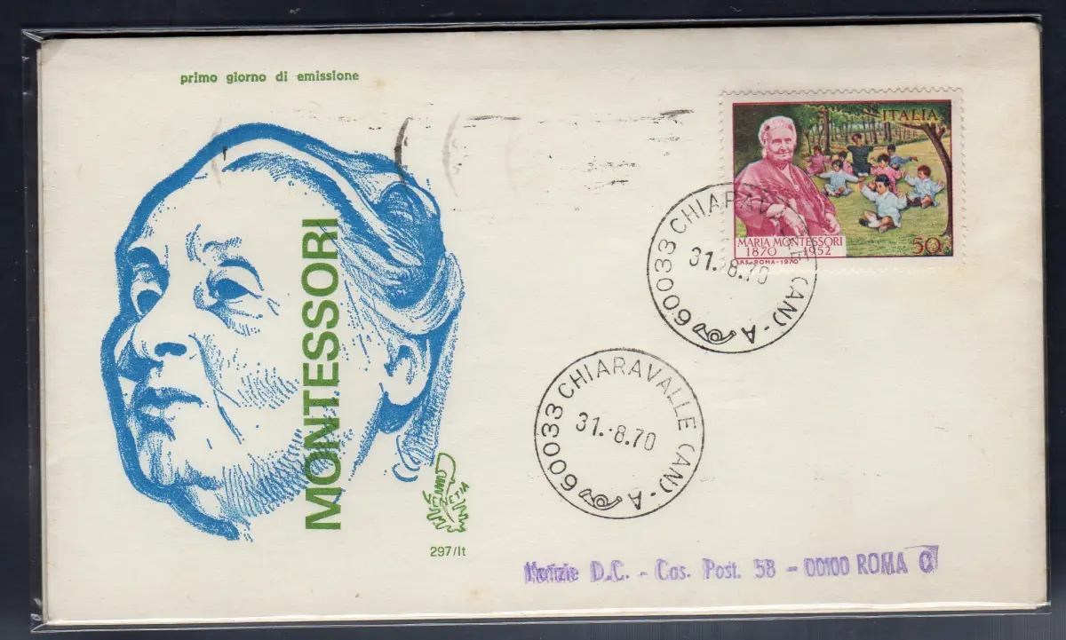 Italien FDC Venetia 1970 Montessori reiste nach Italien Italien 1970 Montessori auf Umschlag gereist nach Italien mit Annullierung der Ankunft Annullo Chiaravalle Cod. 913/Venetia