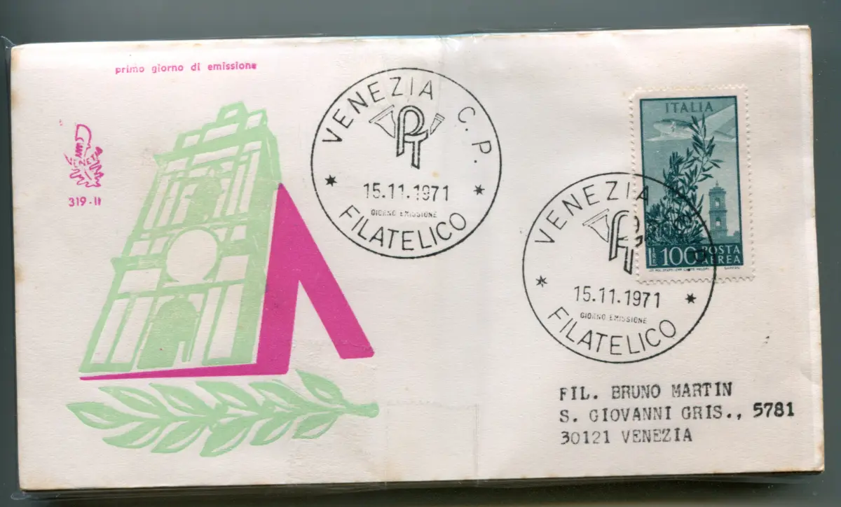 Italien FDC Venetia 1971 Kapitol Lire 100 gereist nach Italien Italien 1971 Kapitol Lire 100 auf Umschlag nach Italien gereist mit Annullierung der Ankunft Annullo Venezia Philatelico - Auf der Rückseite Lire 25 XXV Ann. Vereinte Nationen Cod. 976/Venetia