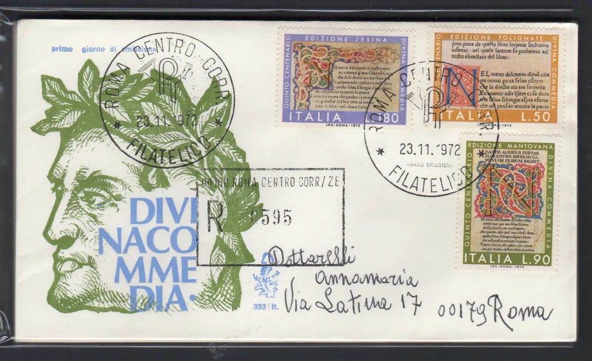 Italien FDC Venetia 1972 Divina Commedia voyata Racc. für Italien 1047 Italien 1972 Göttliche Komödie auf Reiseumschlag Racc. für Italien mit Annullierung der Ankunft - Abfahrt Annullo Roma Philatelico Cod. 1047/Venetia
