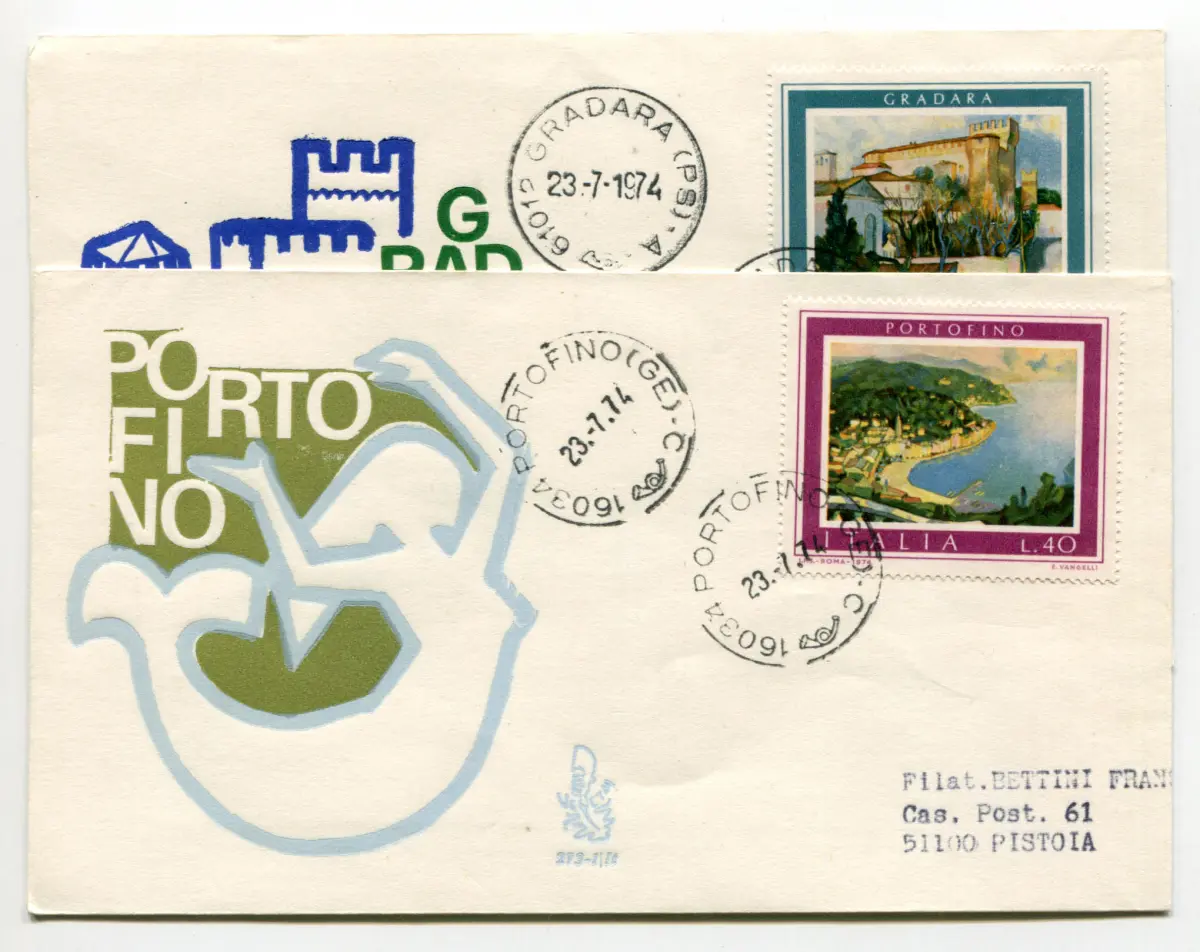 Italien FDC Venetia 1974 Touristische Reise nach Italien Italien 1974 Tourismus auf Umschlag FDC gereist nach Italien mit Annullierung der Ankunft Annullo Portofino und Gradara Cod. 1205 / Venetien