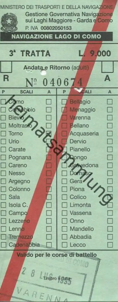 Italien - Lago di Como - Fahrschein 1995 -  3a Tratta L. 9.000