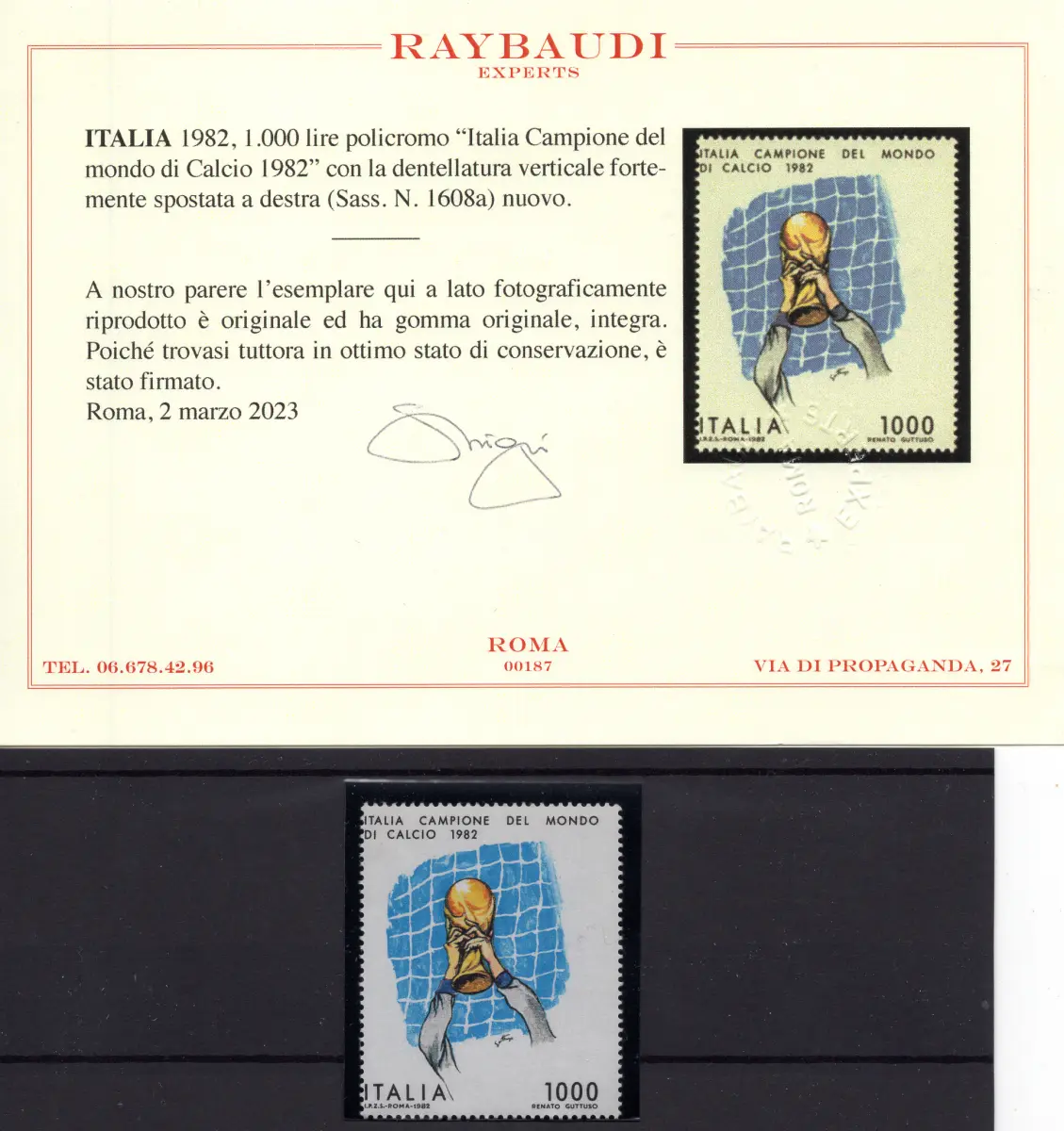 MNH - Vollgummi - - Italien Weltmeister 1982 Lire 1.000 Nr. 1608a stark verschobene vertikale Verzahnung - Ungewöhnlich, wenn man bedenkt, dass das Originalblatt nur 25 Exemplare betrug - Zert. Ray. - Kat. euro 450 Cod.752/182
