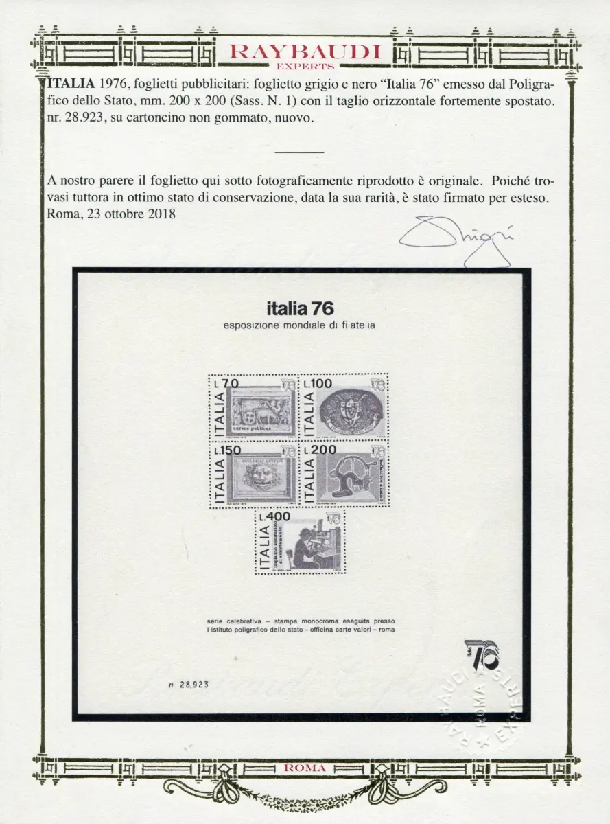 Italienbogen '76 Sorte verschobener Schnitt Vollgummi - MHN - - Werbebogen Italien '76 Nr. 1 mit stark vertikal verschobenem Horizontalschnitt - Selten - Zert. Ray. oro Cod. 932/14