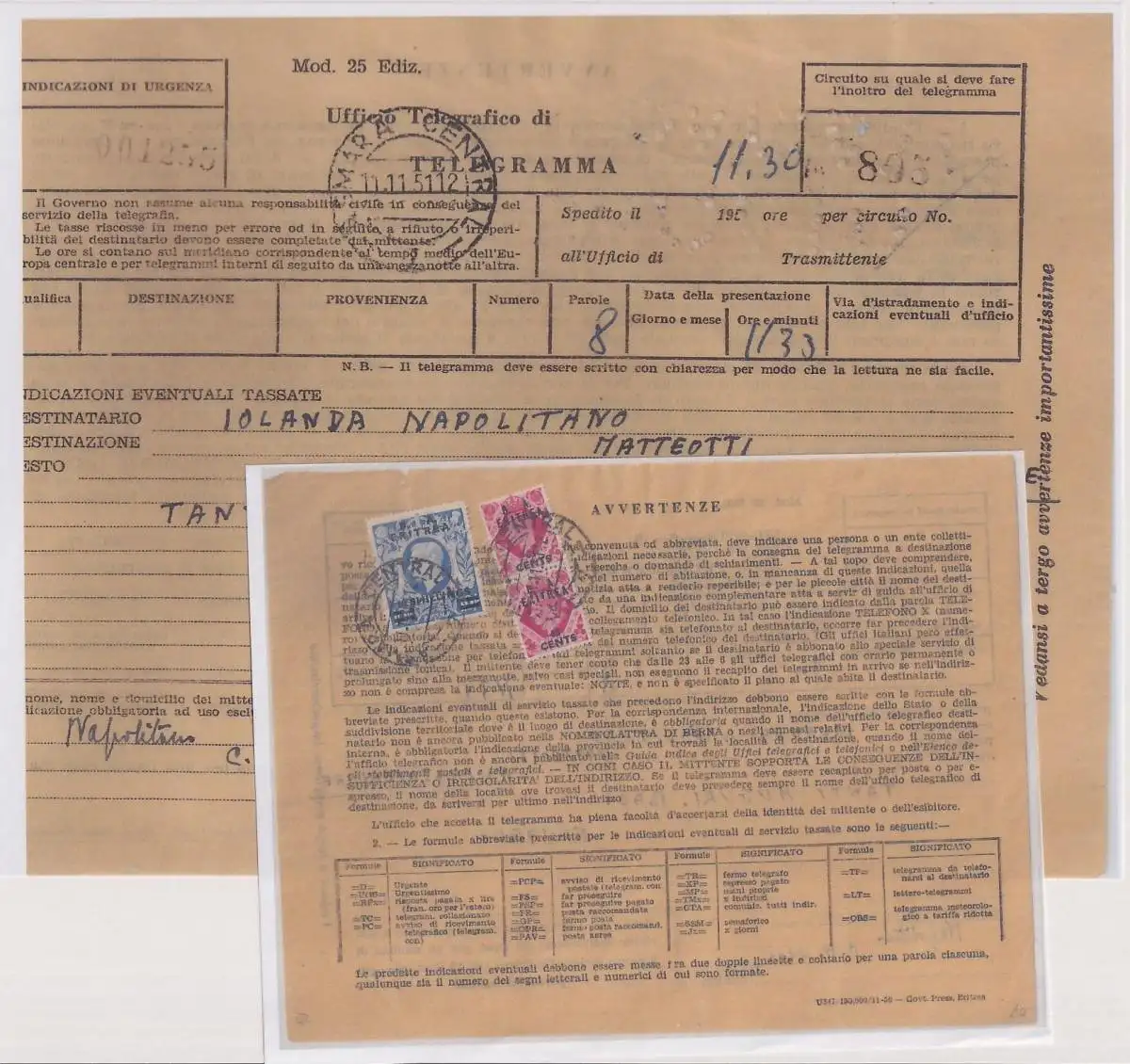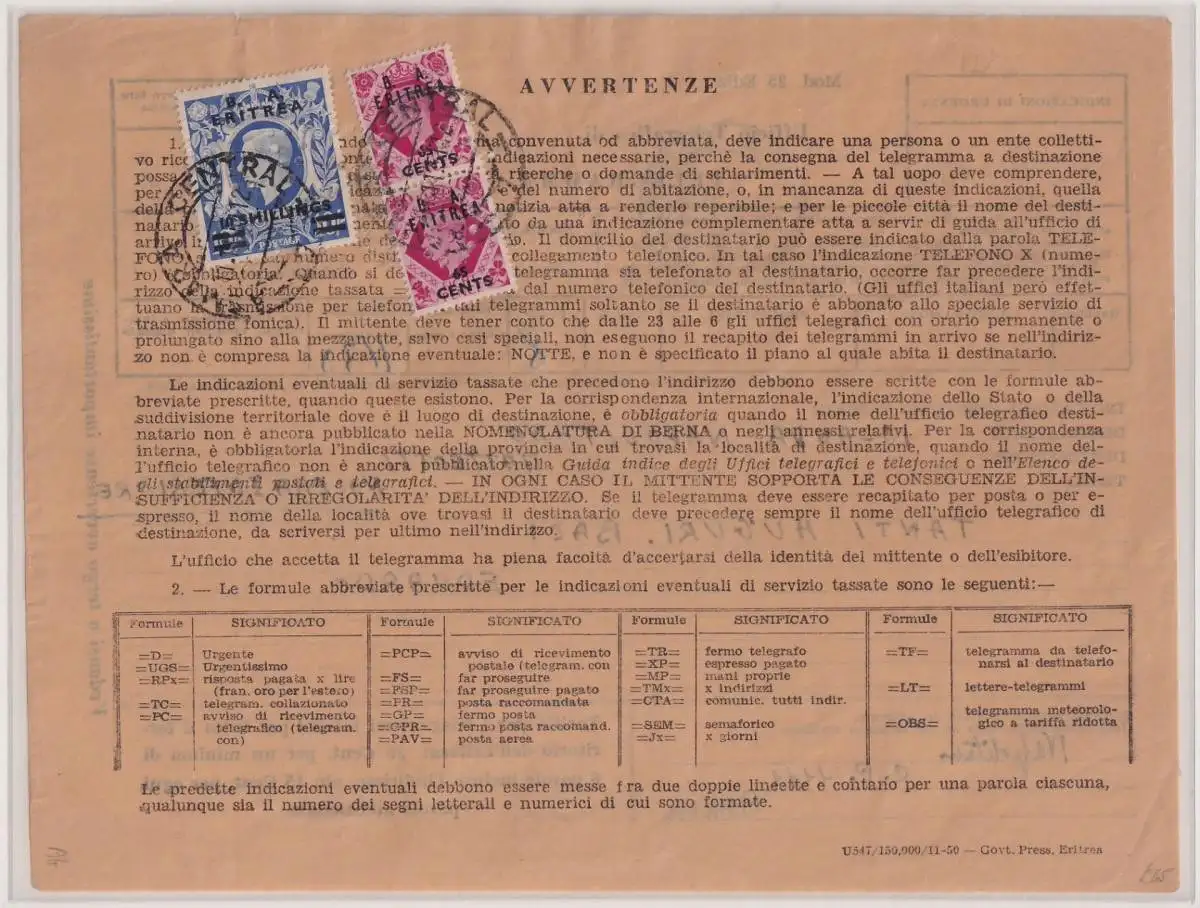 Italienisch-Eritrea Britische Militärpost 26 gestempelt auf Telegram #NK128