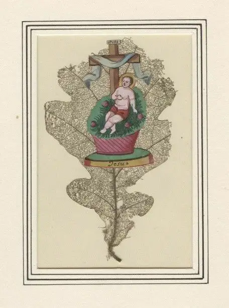 o. O. [2. Hälfte 19. Jahrhundert]. Auf Blattskelett montierte kolorierte Zeichnung eiförmiger Applikation. va. 11, 5 x 6, 5 cm. Blattskelett mit kleinen Fehlstellen.