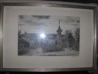 ORIGINAL-RADIERUNG (unter Glas) - (Eau forte originale encadree) von MARCEL JACQUE: La maison de Theodor Rousseau * et l`eglise de Barbizon. Signiert (signe avec titre) mit Bleistift unten rechts sowie im Druck, betitelt v. Künstler