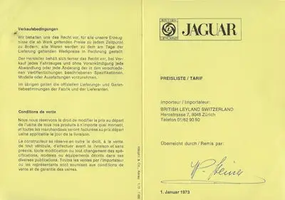 Jaguar Preisliste der Schweiz 1.1973