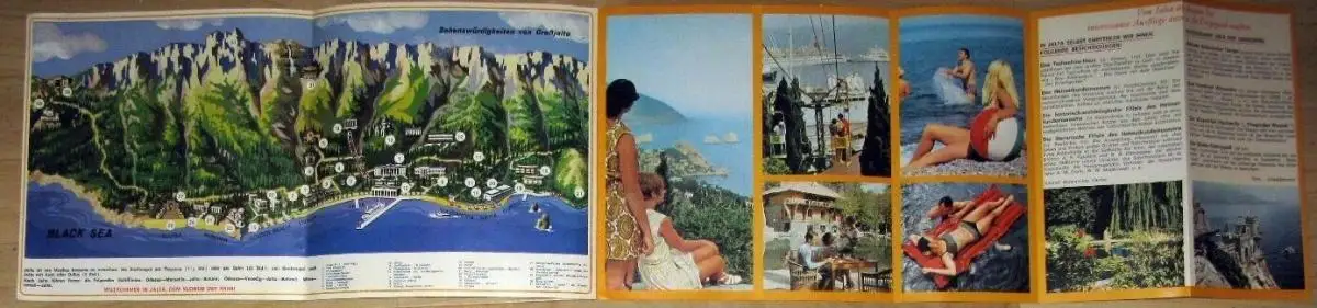 sehr guter Zustand, geringe Gebrauchs- und Alterungsspuren: Seiten teils etwas eselsohrig, Beschreibung und Bewerbung der Stadt und der Region Drucknummer 17240/3, Papier, ca. 23 x 23 (aufgeklappt ca. 102 x 23), 8 Seiten und 2 halbe Seiten mit 12 Farbbildern und einer Panorama-Karte