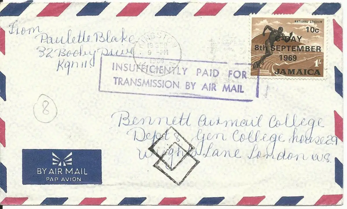 Jamaica 1969, Insufficiently paid for...Air mail auf Brief m. 1 Sh. n. GB