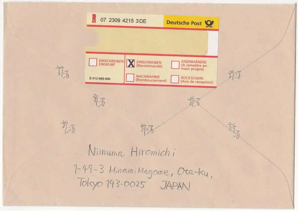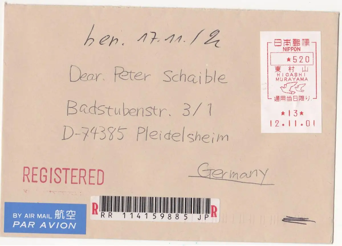 Der Brief ist gelaufen am 12.11.2001 von Higashi Murayama nach Pleidelsheim. Der Briefumschlag ist oben geöffnet. Minimale Transportspuren, sehr guter Zustand.