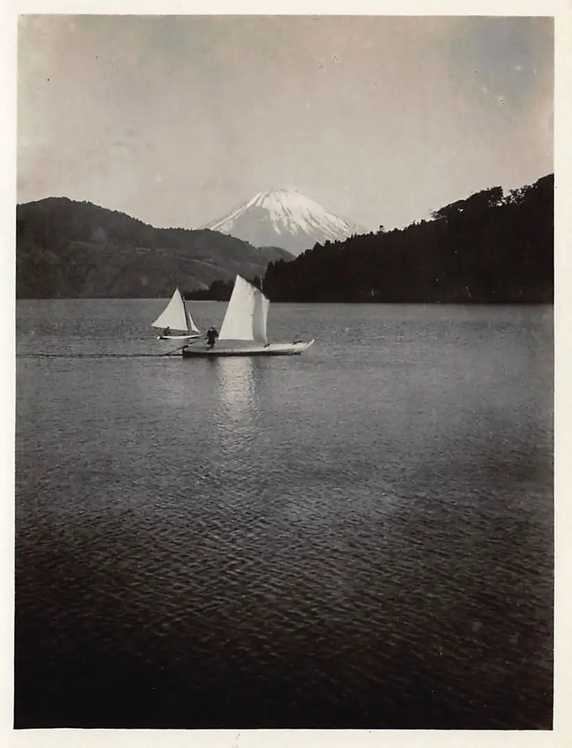 Japan Blick auf Vulkan Fuji vom See Shoji mit Segelboot 160.092